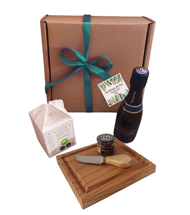1 botella de espumante Valdivieso de 185 ml con bolsa de 3 galletas navideñas, 2 mermeladas productos Mickelsen 25 gr. con cuchillo espátula Packing: Caja de cartón reciclado etiqueta personalizada con cinta de satín a elección.
