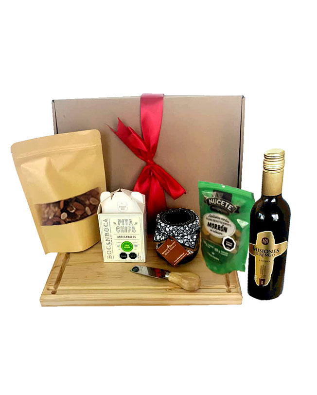 Tabla de madera de pino radiata, mide 18 x 2 x 15 cm. 1 botella de espumante Valdivieso de 185 ml, con cuchillo espátula y 1 frasco de cóctel surtidos (Tapenade, Chutney o Jalea de vino) Productos Mickelsen 25 gr. Packing: Caja de cartón reciclado etiqueta personalizada con cinta de satín a elección.